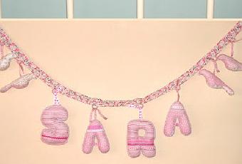Es muy sencilla. Cortas tantos cuadrados de tela como letras quieras poner. Cada cuadrado lo cortas dos veces. Por el revés coses tres de los lados y lo giras al derecho. Planchas cada cuadrado (quedará como una bolsita) Sobre uno de los lados aplicas la letras. Yo uso un papel adhesivo que puede lavarse y no se despega. Finalmente, sujetas con alfileres cada uno de los cuadrados por la parte abierta (la superior) en el interior de una cinta al biés ancha y la coses. Yo le he añadido unos corazones de fieltro por los extremos. Si te apetece hacerla, pincha aquí.