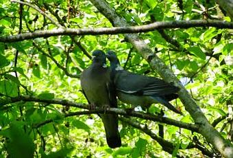 Las torcaces andan ahora de amoríos, arrullándose como buenas palomas que son, y pronto comenzarán a sacar adelante a su prole, como esta pareja que observé hace pocos días en un área urbana de Tineo. Cría de abril a agosto, generalmente con dos puestas, depositadas en un nido situado en árboles y de construcción frágil en forma de plataforma poco espesa, a base de ramitas secas.