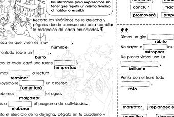 -Recorta los sinónimos de la derecha y pégalos donde corresponda para cambiar la redacción de cada enunciados.
