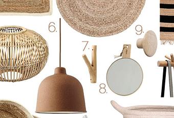 1. Servilletas Sunshine de Himla, 2. Mantel individual Emil de Dixie, 3. Alfombra redonda de yute de Dixie, 4. Alfombra de yute Felix de Dixie, 5. Pantalla de lámpara Zep de Broste Copenhagen, 6. Lámpara de techo colgante Grain de Muuto, 7. Gancho de madera de Bloomingville, 8. Espejo Ping Pong de OYOY, 9. Colgador de pared The Dots de Muuto, 10. Percheros Sticks de Normann Copenhangen, 11. 3 Cestas para pan Emil de Dixie, 12. Cepillo limpiavajilla Vardag de Iris hantverk, 13. Jabón artesanal con cuerda de Iris hantverk, 14. Cesta Eleonora de Boel & Jan.