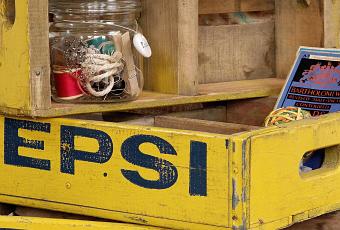 Una selección de piezas únicas, realizadas a mano en el Reino Unido junto a otras "vintage", tarros de conserva recuperados, cajas originales de populares bebidas como Coca-Cola ó Pepsi en azul y amarillo,