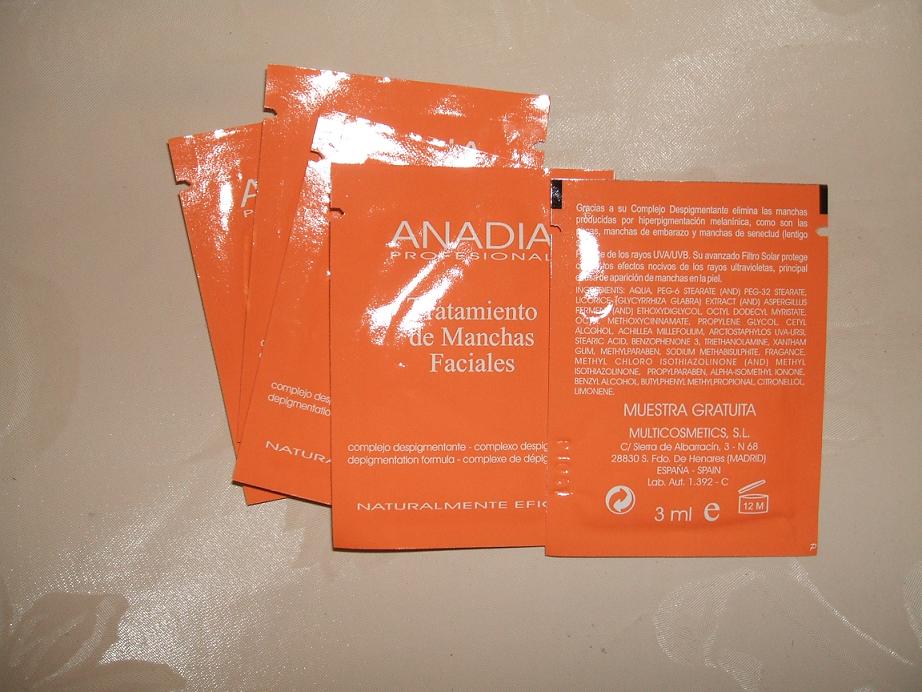 La primera muestra que os presento, se trata de un tratamiento de manchas faciales. Yo no tengo muchas manchitas en la piel, pero si algunas pecas que no me agradan nada.Tiene un complejo despigmentante que elimina las manchas como las pecas, manchas de embarazo y manchas de senectud. Contiene filtro solar, que protege de los rayos UVA/UVB.He notado que las pequitas que tenía cerca de la nariz han disminuido bastante. Además es una crema ligerita, algo cremosa, muy agradable que se absorve rápidamente por la piel. Me ha impresionado mucho ver sus efectos.