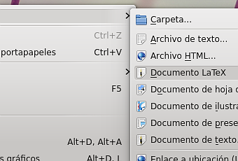 En el siguiente ejemplo, voy a explicar cómo añadir una nueva entrada para crear archivos de LaTeX para tener un menú como el que se ve en la captura de pantalla. El procedimiento va a ser siempre el mismo así que luego ya podréis crear las entradas que prefiráis o también quitar algunas de las que vienen por defecto.