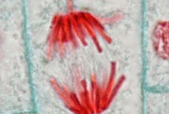 Figura AM-01. La anafase de la mitosis se caracteriza por la separación de los cromosomas. La resolución de esta foto es muy buena y permite no solo ver a los cromosomas sino también a los microtúbulos astrales proyectándose de manera radial desde los polos de la célula.