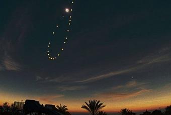 Esta foto se llama Analemma, y consiste en fotografiar el sol todos los dias del año a la misma hora, durante un año.Los puntos más altos son los solsticios, el de arriba el de verano y el de abajo el de invierno. El centro son los equinoccios.Esta foto, además, incluye un eclipse. Una Analemma con un eclipse se llama Tutulemma. Impresionante!