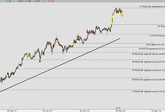 Zona 31.35 euros que ha servido para formar un pequeño techo en las semanas previas e iniciar un descuelgue de la cotización que podría dirigir al precio hacia los entornos de los 28.38 euros.
