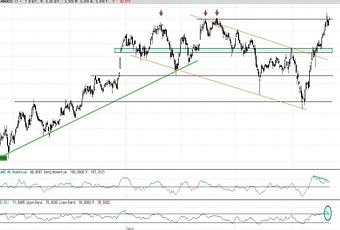 Los indicadores técnicos que acostumbro a utilizar para mi operativa tampoco me ayudan a eliminar estas sospechas, ya que el Momentum me estaría indicando una divergencia bajista (tanto en el gráfico semanal como en el diario) que fortalece el argumento de un cambio de tendencia; y el RSI, que parece abandonar la zona de sobrecompra, y ya sabemos lo que la teoría del análisis técnico nos quiere decir con eso.