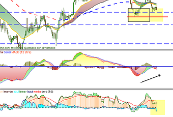 El MACD está alertando de que el movimiento no tiene un gran seguimiento. El Histograma esta muy ligeramente por debajo de la línea cero y las líneas del MACD están muy cercanas a la línea cero.
