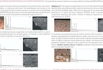 2. ESTUDIO MEDIANTE MICROSCOPÍA ELECTRÓNICA CON DETECTOR DE RAYOS-X. El estudio de las muestras mediante microscopía electrónica de barrido (SEM/EDX) ha permitido obtener los siguientes resultados: · Muestra n.1. Al microscopio se observa la presencia de granos de árido de colores ocre-rojizo y gris, con formas irregulares, y cristales de color blanco más redondeados conviviendo en una matriz de color beige. En la superficie de la muestra se aprecia un estrato muy fino de tonalidad grisácea. El análisis SEM-EDX del área de la sección transversal del mortero permite identificar la presencia de calcita, yeso y minerales silíceos (aluminosilicatos de magnesio y hierro). Los granos de árido de tonalidad ocre-rojiza corresponden a minerales silíceos de hierro, como lo indica el análisis puntual obtenido para uno de estos granos. Al analizar la capa superficial mediante SEM/EDX se detecta la presencia mayoritaria de calcita.