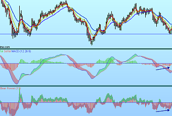 En el gráfico semanal del par euro-dolar, se puede observar como la zona 1,26 donde se ha parado la corrección es una zona especialmente importante y donde muchos traders han cerrado sus posiciones cortas, provocando el pequeño rally del que ahora disfruta el euro. Interesante las divergencias del histograma del MACD y el Elder-Ray (he tenido que usar este indicador, muy similar al Índice de Fuerza, por que en Forex no hay volumen y por tanto el Índice de Fuerza no funciona, al menos en esta plataforma). Pienso que la caída del par euro-dolar pueden haber llegado a su final de medio plazo, la zona me parece lo bastante fuerte como para no ser violada, máxime cuando en todos los sitios recomiendan ponerse corto en el euro-dolar, cuanto menos me mosquea que todas los brokers les parezca bueno o muy bueno ponerse corto en los rebotes.