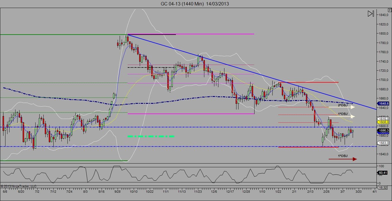 Como indiqué unas líneas arriba, vemos como el precio se mueve en un gran rango lateral desde Octubre de 2011 hasta el día de hoy, dejando claramente visibles el soporte y la resistencia. Actualmente, el precio viene cayendo en un canal bajista muy sano que ha llegado a los niveles de soporte (zona de 1565.0), donde ha frenado. Se nos plantean tres posibles situaciones: que corrija, que permanezca lateral o que rompa el soporte. Hay que tener estrategias bien definidas para cada escenario, y para eso nos vamos al gráfico diario.