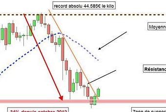 El oro da un paso decisivo! La oblicua NARANJA que bloquea el avance del rey de los metales preciosos desde hace varios meses está a punto de romperse! Es cierto que estamos muy lejos de romper la media móvil (punteo azul), pero es importante empezar por algo. No es porque atravesemos la famosa media azul al alza que la tendencia de fondo no seguirá siendo bajista, pero hemos recuperado el 13% en comparación al punto más bajo del 2013.