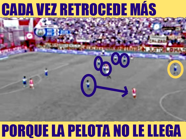 Vean que la posición de Riquelme es la adecuada. Está en un lugar del campo en donde de surtir efecto la presión quedará solo para recibir, porque gana a espalda del marcador de Argentinos (círculo rojo), perfilado para escapar por la zona libre (línea blanca), y con la posibilidad de hacer "el uno dos" con el delantero que también ya está perfilado en la imagen para obstruir el anticipo del defensor. Posicionalmente Boca es excelente en estas jugadas.