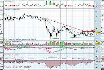 Pero por otro lado el comportamiento que nos muestra el RSc Mansfield de Arcelor frente al S&P 500 es muy bueno ya que, aunque es negativo su pendiente es positiva. Por tanto, lo ideal sería esperar a que el precio alcanzara los 13,45€ que es la resistencia a la que se tiene que enfrentar en estos momentos. Si la rotura de esta resistencia se produce con volumen entonces podríamos tener lo que llamamos un entrada ideal.