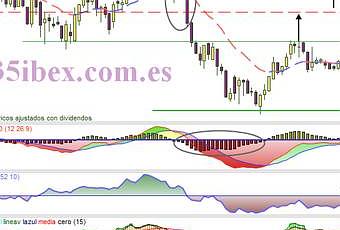 En el gráfico semanal de Bankinter hay unos puntos muy interesantes. Primero tenemos como el Mansfield nos muestra como ha pasado a mejor que el mercado, está claro después del día de hoy. El MACD ha hecho intenciones de girarse a la baja y se ha dado la vuelta, para mi un fallo bajista, con implicaciones alcistas.