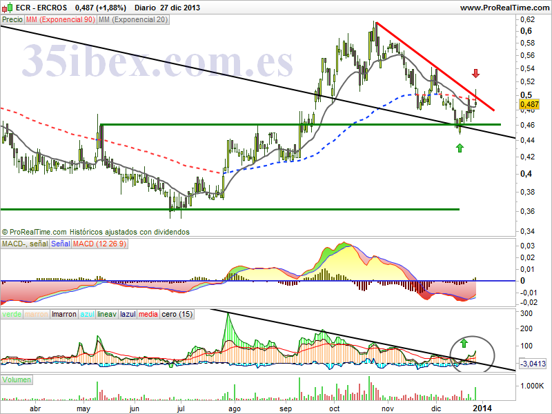 En este plazo temporal el valor empieza a ser más interesante para Trading. Digo para Trading, por que nunca pensaría seriamente en invertir en un valor como Ercros. No por nada en particular, si no por que no me siento cómodo en este tipo de valores.
