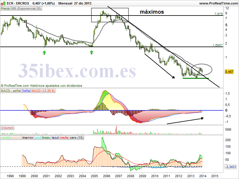 En el gráfico mensual se puede ver como entre 2005 y 2006 Ercros realizo un doble techo, con máximos en la zona 10.60 euros.Curioso como un valor puede pasar de 10.60 a 1.70 en un par de años, tanto para subir como para bajar, por que de 2004 a 2005 lo hizo, y luego de 2006 a 2008 hizo el camino de vuelta. Esto es lo que tienen este tipo de valores, a los que tengo un miedo impresionante, creo que son máquinas de triturar pequeños inversores.