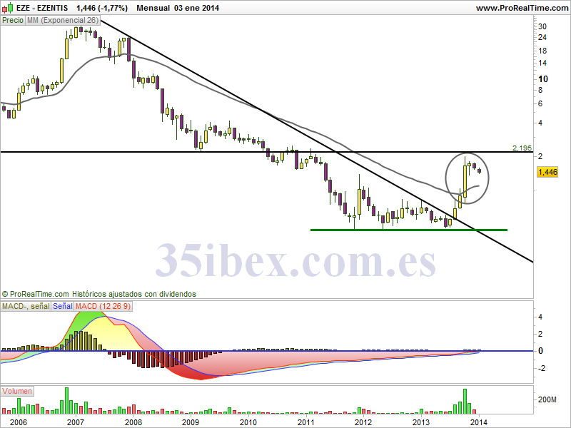 Ezentis es un valor claramente bajista, pero que está luchando por salir de sus mínimos. La línea de tendencia bajista ha sido rota, y se podría considerar que la tendencia bajista ha terminado, pero con un valor así, yo exigiría algo más, como sería ver que cotiza por encima de los 2.20. Esa parece ser una zona en la que el valor cambiará completamente de sesgo.