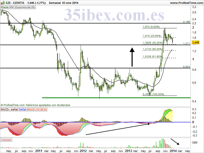 El precio se está situando justo por encima de la resistencia rota de 1.37, pero he tirado un fibo por que no descarto que sea rota y busque otros niveles, comoel 50 o el 62 de fibo, todo esto sin romper la tendencia de medio plazo actual.El MACD se está cortando a la baja, pero el volumen está disminuyendo, que es lo que deberíamos esperar en una tendencia alcista sana, que el volumen descienda cuando el valor recorta.Gráfico diario de Ezentis