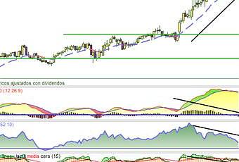 En el gráfico diario de Inditex, vemos la enésima divergencia bajista en el MACD, pero lo mas significativo que aprecio en los indicadores es la abultada venta de mano fuerte.
