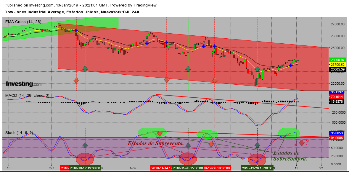 Como se da a conocer en el Artículo Referencia acerca del "Padre" del Análisis Técnico: Charles Henry Dow, este "Hombre Extraordinario" fue el Fundador del Wall Street Journal y de uno de los Índices Referencia más Importantes del Mercado Norteamericano de Índices conocido como "Wall Street", NYSE o New York Stock Exchange; por tanto y, a manera de Homenaje/Ilustración, les dejo un Análisis Técnico de Corto/Medio Plazos muy "Sintético" (Horizonte Temporal de 3 Semanas a 3 Meses, Chart de Velas Japonesas de 4 Horas correspondientes al Cierre de la Semana 2 del año en curso: 2019) del Índice Dow&Jones...: