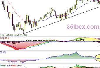 Los indicadores muestran que la acción se está moviendo muy lateralmente desde hace tiempo, el comportamiento relativo con respecto al IBEX 35 está pasando a peor, pero no por que esté cayendo mucho, simplemente por que está muy lateral. La mano fuerte hace tiempo que salió del valor, y aunque no no vende de forma significativa, tampoco está dentro del valor. Ojo, el histograma del MACD a pesar de las caídas esta marcando puntos ascendentes. En el gráfico diario de Técnicas Reunidas, podemos ver como el histograma del MACD se está girando a la baja, no ha podido superar la confluencia de las medias, de corto y largo plazo.