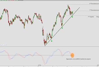 - Indicador MACD relativamente fiable en sus cruces con la señal, señal de compra y venta según la interpretación de este indicador.