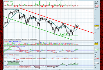 Tras alcanzar los 6,65€ el precio realizó un giro a la baja para dirigirse hacia la resistencia del canal bajista que ahora hace las veces de soporte. Al llegar aquí, se apoyó con la intención de realizar un pullback. La mm de 30 sesiones se mantiene alcista.Y en mensual podemos ver como este impulso alcista tiene apoyo en un doble suelo en los 4,45€ de gran separación temporal (6 años) lo que le confiere una gran fortaleza.