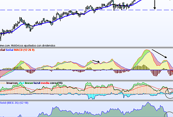 En definitiva el gráfico semanal nos muestra: precio por debajo de la media, comportamiento peor que el mercado, pero...la mano fuerte sigue dentro, esto me frenaría para abrir cortos (si se pudiera).