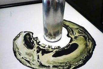 Nos vamos a fijar, por ahora, solo en sus anamorfosis. A Dalí no podía pasarle desapercibida la enigmática pintura de Los embajadores de Holbein y su oculta calavera. La forma de homenajearla es una anamorfosis cilíndrica sobre una botella plateada de ponche.