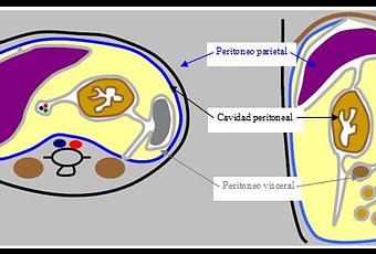 • La membrana más extensa del cuerpo (1,8m²) que recubre la superficie interna de la cavidad abdominal –peritoneo parietal– y se extiende cubriendo varios órganos intraabdominales constituyendo su capa serosa –peritoneo visceral-. El espacio que queda entre ellos es la cavidad peritoneal que en condiciones normales sólo contiene una pequeña cantidad de líquido (50-100 ml).