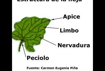 La hoja es una estructura plana y más o menos ancha que se une al resto de la planta a través de una estructura cilíndrica llamada peciolo, por donde penetran los haces conductores. Estos mismos haces se continúan en la hoja haciéndose patentes en forma de nervios. Los nervios foliares son típicamente ramificados en las plantas dicotiledóneas, y paralelos en las monocotiledóneas, siendo éste uno de los caracteres que se utilizan en la diferenciación de ambos grupos. La parte ancha y plana de la hoja recibe el nombre de limbo.La morfología de las hojas es muy variable, y en muchos casos tiene carácter adaptativo, permitiendo que la planta aproveche mejor o peor los recursos de su entorno. De este modo, las hojas pequeñas minimizan la pérdida de agua, mientras que las hojas grandes y anchas aumentan la posibilidad de captar la luz, aumentando la eficacia fotosintética.