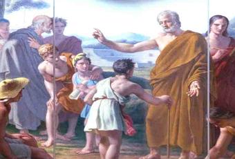 Vemos al joven Anaxímenes sujetando el gnomon mientras sigue las explicaciones de su maestro, y otro discípulo va marcando las señales horarias y un tercer toma nota.