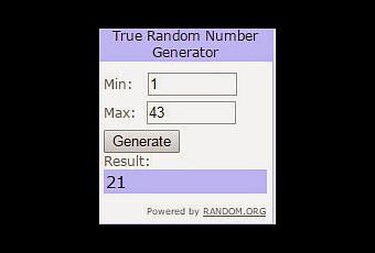 En el siguiente concurso, no hubo ganadoras por la O.N.C.E, así que Randm.org. nos dejó este resultado, y yendo a la lista , la ganadora es:"Ester Fernández García"¡¡¡¡¡¡¡¡¡¡¡¡¡Felicidades a las dos!!!!!!!!!!!!!!!!!A todas,tanto a las afortunadas como a todas las que participaron,¡¡¡gracias!!!!!