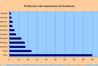 Los problemas más importantes para los andaluces son el paro (89,3%), la crisis (23,6%), el mal funcionamiento del sistema educativo (17,1%), los políticos (16,4%) y la sanidad (12,6%).Un 65,6% de los encuestados no ve ninguna oportunidad de empleo para los jóvenes y el 58,4% no trabaja en la actualidad, de los que el 63,6% son jóvenes con edades comprendidas entre los 18 y los 29 años. Casi el 26% han reconocido que en los últimos seis meses se han visto obligados a pedir dinero a familiares y amigos para poder llegar a fin de mes.