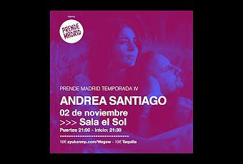 Andrea Santiago se subirá al escenario de El Sol este miércoles, un concierto dentro del ciclo Prende Madrid. El ciclo de conciertos Prende Madrid, propone este Miércoles en El Sol un directo con una voz muy especial.Andrea Santiago estará en el escenario de El Sol, será un gran escenario para presentar las canciones de Prenderle fuego a todo, un disco en formato LP lanzado este año que estará dentro de su repertorio, para la ocasión, habrá espacio para los temas de sus anteriores trabajos, todo en un entorno cercano y con la magia de la puesta en escena. #Datos:2/1121:00Sala el SolEntrada anticipada desde 10 euros / Taquilla 13 euros