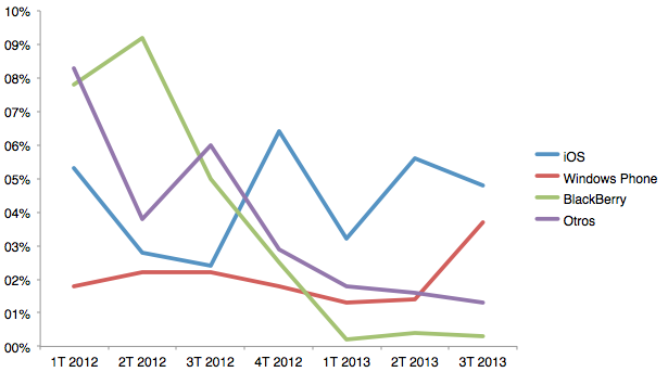 Y entre ese lío de minorías que hay se saca este gráfico más claro en el que los sistemas operativos minoritarios se pelean por un 1%.Cuota de mercado de sistemas operativos móviles en España (Android no incluido)