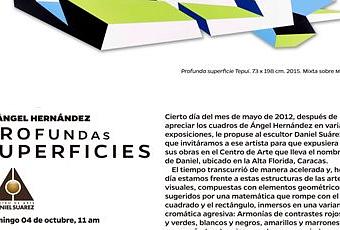 InvitaciónEl Arte Geométrico de Ángel Hernándeztoma los espacios del Centro de Arte Daniel SuárezUna selección de obras del artista venezolano Ángel Hernández conforman la exposición individual “Profundas superficies”, que será inaugurada el domingo 4 de octubre a las 11:00 a.m. en la sede del Centro de Arte Daniel Suárez, ubicada en la urbanización Alta Florida, donde podrá ser visitada hasta el 8 de noviembre de 2015.
