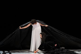 Después de una larga pausa, las sibilas que anuncian el fin del mundo lapidan a una mujer que viste como Judith. Pasamos del entorno psicológico de la protagonista de Bartók al mundo alegórico de Orff. Los textos en griego, latín y alemán añaden una lectura atávica a lo que presenciamos, una breve historia del pecado y de la culpa que desemboca en el juicio final, con un escenario poblado por las almas que esperan. Es uno de los cuadros con mayor fuerza visual de esta producción. El escenario se despobla ante la presencia de Lucifer, que arrastra la puerta del infierno (una puerta más, como las de Judith) y la deja caer pesadamente. El ángel caído, el que fuera portador de la luz antes de su rebelión en el principio de los tiempos, pide perdón al padre con la fórmula del hijo pródigo por tres veces, como las negaciones de Pedro. La figura se va desprendiendo de su culpa y el príncipe de los demonios vuelve a ser ángel e hijo de la aurora, que es lo que significa Lucifer en latín. Judith y Barbazul, que en realidad aquí son el símbolo de la primera pareja, Adán y Eva, se acercan al nuevo Lucifer para devolverle la manzana. Todo queda perdonado. Y así, de esta sutil manera, estas dos composiciones quedan unidas en el escenario.