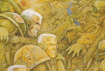 Para terminar el dia,una curiosidad.Es una imagen del año 1989 y es obra de Wayne England(Alguno de sus primeros trabajos supongo).Es una imagen de una batalla entre los orkoz del Klan Mordizko de Vibora contra los Ángeles Sangrientos en un entorno desértico.Y estos últimos no llevan su tradicional color rojo,si no que usan camuflaje adecuado para el desierto,tanto marines como vehiculos.Es una imagen curiosa,creo yo.Dos cosas que destaco:Una que los Ángeles Sangrientos sin casco parecen clones,con el mismo corte de pelo,y rasgos faciales.Otra,la imagen central del bibliotecario(Darnest),reconocible por la antorcha,que en la época del RT ,servia como símbolo para reconocer su rango antes de la imposición del sistema codex en la segunda edición.