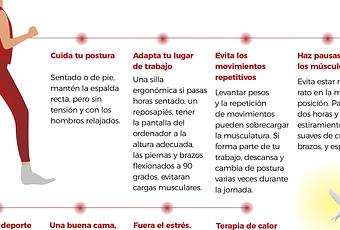 “Cuidar la postura es la base de una buena salud musculoesquelética”, explica. “Se esté sentado o de pie, debe mantenerse la espalda recta pero sin tensión y los hombros relajados para no cargar la zona lumbar, dorsal y cervical”.