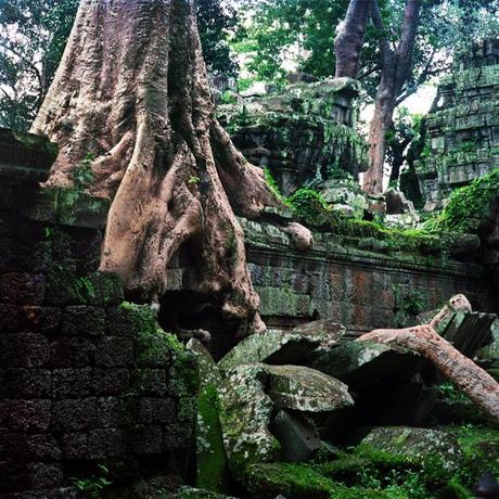 Madariaga fotografía sus principales templos, Bayon, Angkor Wat... pero las imágenes más impactantes son las de Ta Prom, el único templo que no ha sido restaurado y en el que el fotógrafo se recrea para demostrarnos cómo la naturaleza ha ido ganando terreno y los árboles, con sus enormes raíces que invaden los monumentos, están tan integrados que es difícil distinguir el límite entre naturaleza y escultura.