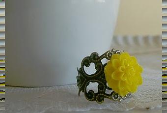 Bonito anillo ajustable con roseta amarilla. Es de filigrana y la flor de plástico.
