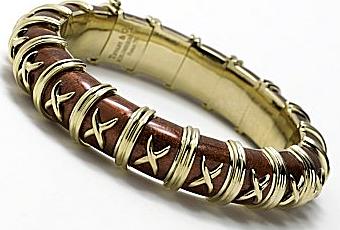 Brazalete Bamboo de oro amarillo de 18 quilates, Jean Schlumberger para Tiffany & Co, Sortija Stitches de oro amarillo y diamantes, Jean Schlumberger para Tiffany & Co.