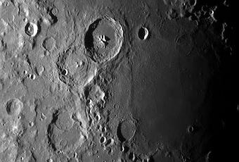Y más al sur aún está Catharina con 100 km de diámetro. Mucho más antiguo y erosionado. En su pared ya no se ven terrazas, erosionadas por completo. El fondo presenta impactos de tamaño moderado que fueron posteriormente inundados por la lava. Además, el pico central ha desaparecido por completo lo que nos indica su mayor antigüedad.
