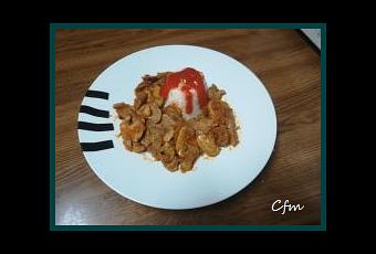 Y listo...Es el momento de servir...Ponemos el arroz en un vasito y lo volcamos con cuidado en un plato, ponemos alrededor la carne con los champiñones y en la parte de arriba del arroz un poco de salsa de tomate frito casero...Que aproveche...