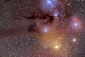 Rodeada por el polvo, Antares, una estrella supergigante roja, crea una extraña y resplandeciente nebulosa de reflexión amarillenta. Por encima de ella, la estrella doble azul Rho Ophiuchi se encuentra incrustada en una de las nebulosas de reflexión azuladas más típicas, mientras que las nebulosas de emisión rojas se diseminan por la región.