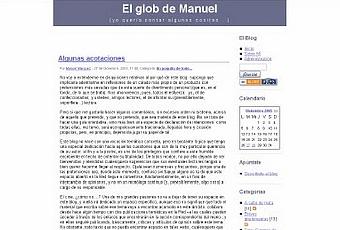Ése de arriba es el texto con el que comenzaba mi andadura bloguera, en la “cibercasa” de que disfruté con anterioridad a ésta, y a la que pueden encontrar, amigos lectores, un enlace en la columna izquierda de este blog, bajo el epígrafe “Otras webs que me cobijan” (El "viejo" glob de Manuel). Una cibercasa alojada en Zoomblog, y cuyo aspecto visual es el que pueden observar en la imagen que ilustra este artículo. Y una cibercasa a la que pienso dar cierre próximamente, una vez finalice esta tarea, a la que ahora doy comienzo con esta reseña, de trasladar todos sus contenidos a este blog.No les puedo negar que me sorprende una enormidad verificar cómo, pasados casi cinco años desde que escribí esas palabras, podría seguir, a estas alturas, suscribiéndolas con muy ligeros matices. Eso sí, no me pregunten si eso me parece bueno o malo: me siento absolutamente incapaz de contestar esa pregunta...