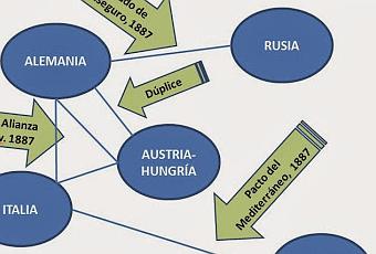 "Alemania reconoce los derechos históricamente adquiridos por Rusia en la Península de los Balcanes y particularmente la legitimidad de su preponderante y decisiva influencia en Bulgarioa y en Rumelia oriental". Art. II del Tratado de Reaseguro. Claramente, chocaba con la alianza Austro-Alemana y con el pacto del Mediterráneo. Si Austria descubría este pacto germano-ruso podía sentirse molesta, en previsión, Bismarck se adelantó y renovó la Triple Alianza en 1.887. PACTO DEL MEDITERRÁNEO En este mismo año de 1.887, Alemania potenció el entendimiento entre Inglaterra e Italia en el Pacto del Mediterráneo, al que se unieron posteriormente Austria y España. Un tratado con acuerdos vagos cuyo objetivo era simplemente mantener el estatu quo en el Mediterráneo y mares limítrofes. Así, conseguía acercar a Inglaterra a la Triple Alianza y dejar más aislada a Francia.