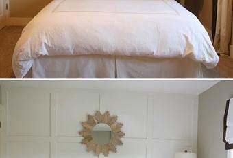 La idea del cabecero blanco de madera que ocupa toda la pared nos parece sencilla y muy bonita. Da una imagen limpia y acogedora que crea un ambiente especial y único, con el detalle del espejo sol que sin duda se lleva la mayor parte del protagonismo.